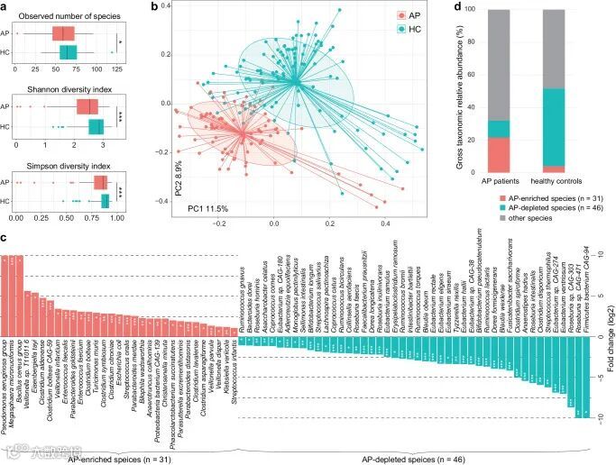 图1 AP患者和健康对照者肠道微生物相关分析结果