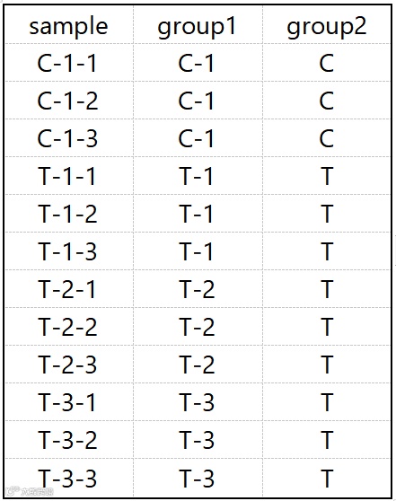 列分组信息表即样本信息对应的分组,应当至少包含两列,每一列的第一行作为列名称处理。其中第一列为样本名,内容必须与输入表格的第一行对应;其余列均为分组信息,内容为对应分组方式的组名称,可输入一个或一个以上的分组信息。