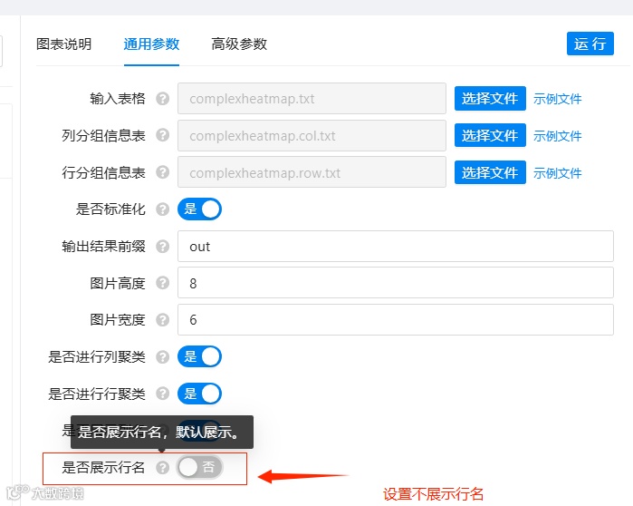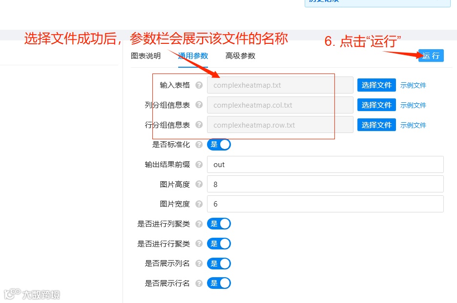 参数设置的区域包括三部分,第一部分为图表说明,其中包含工具的介绍,输入文件的格式和内容说明、参数调整的说明、结果文件的说明以及常见报错处理方式,建议详细阅读;第二部分为通用参数,可以上传文件,设置基本参数;第三部分是高级参数,用来对结果图片做进一步调整。