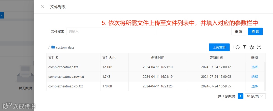 4. 上传成功后会跳转到文件列表窗口,依次点击选择对应的文件(上传后的文件保存在这里,如果之前上传过该工具的文件,可以直接选择之前上传的文件);