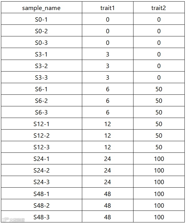 第一列为样本名,后续列为对应表型的值,列名为表型名称(使用字母+数字组合,不要使用中文和特殊字符),为数值,如果是质量性状,可输入1或0。必须注意的是表型文件中的样本名顺序需要与表达量文件中的顺序一致。如下所示: