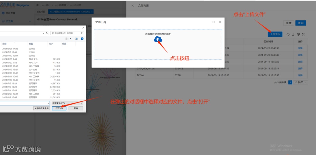 2. 进入文件列表窗口,点击上传文件,点击上传文件的按钮,在弹出的对话框中选择准备好的文件。