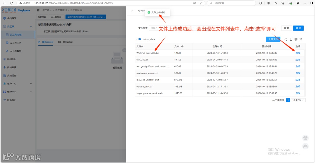 3. 上传成功后会跳转到文件列表窗口,点击选择对应的文件(上传后的文件保存在这里,如果之前上传过该工具的文件,可以直接选择之前上传的文件)。