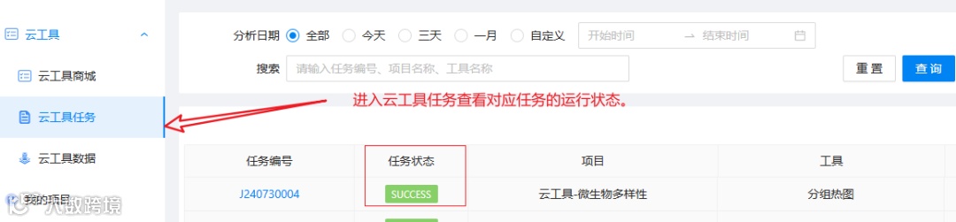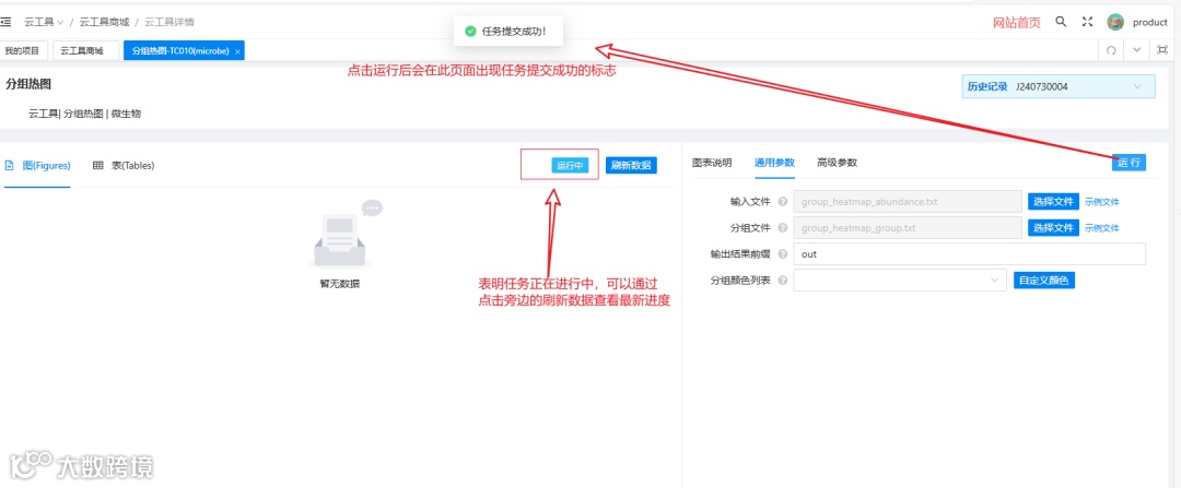 5.点击运行,会在页面上方出现任务提交成功标志。可以通过刷新任务或进入云工具任务查看对应任务的进度。
