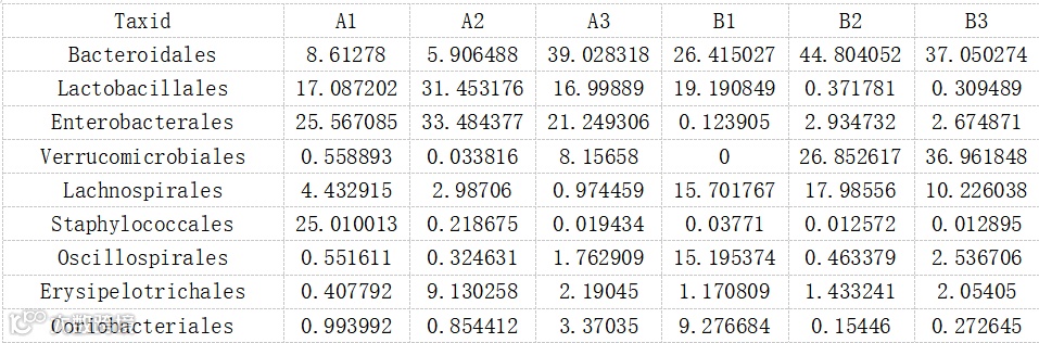 输入文件为微生物丰度表或基因表达量文件,文件中第一行为样本名称,第一列为物种名称或基因名称(注意:物种名称或基因名称中不能包含相同的名字),如下所示: