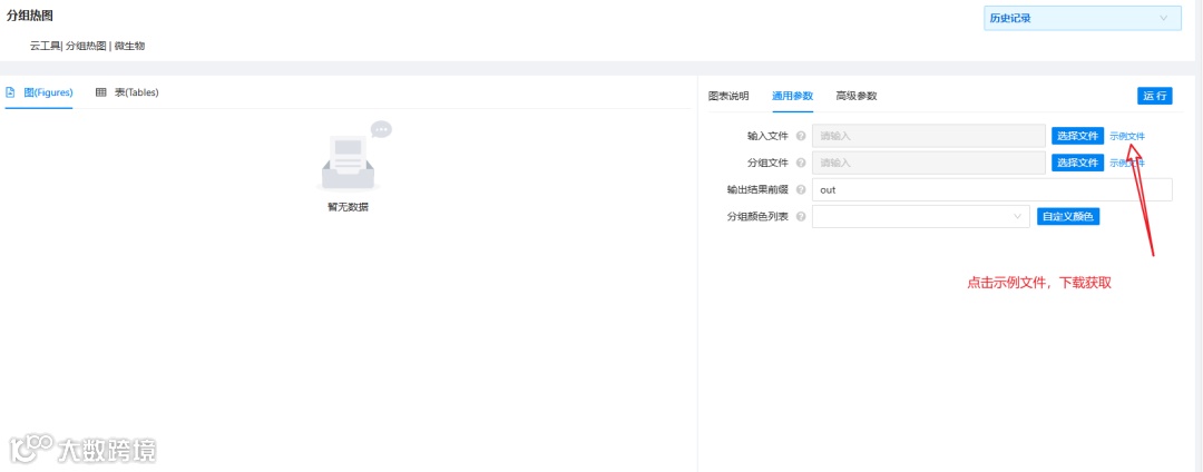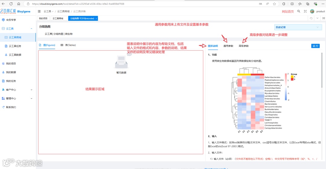 参数设置区域包括三部分,第一部分为图表说明,其中包含工具的介绍,输入文件格式和内容说明,参数调整说明,结果文件说明,以及常见报错处理方式,建议详细阅读;第二部分为通用参数,可以上传文件,设置基本参数;第三部分是高级参数,用来对结果做进一步调整。