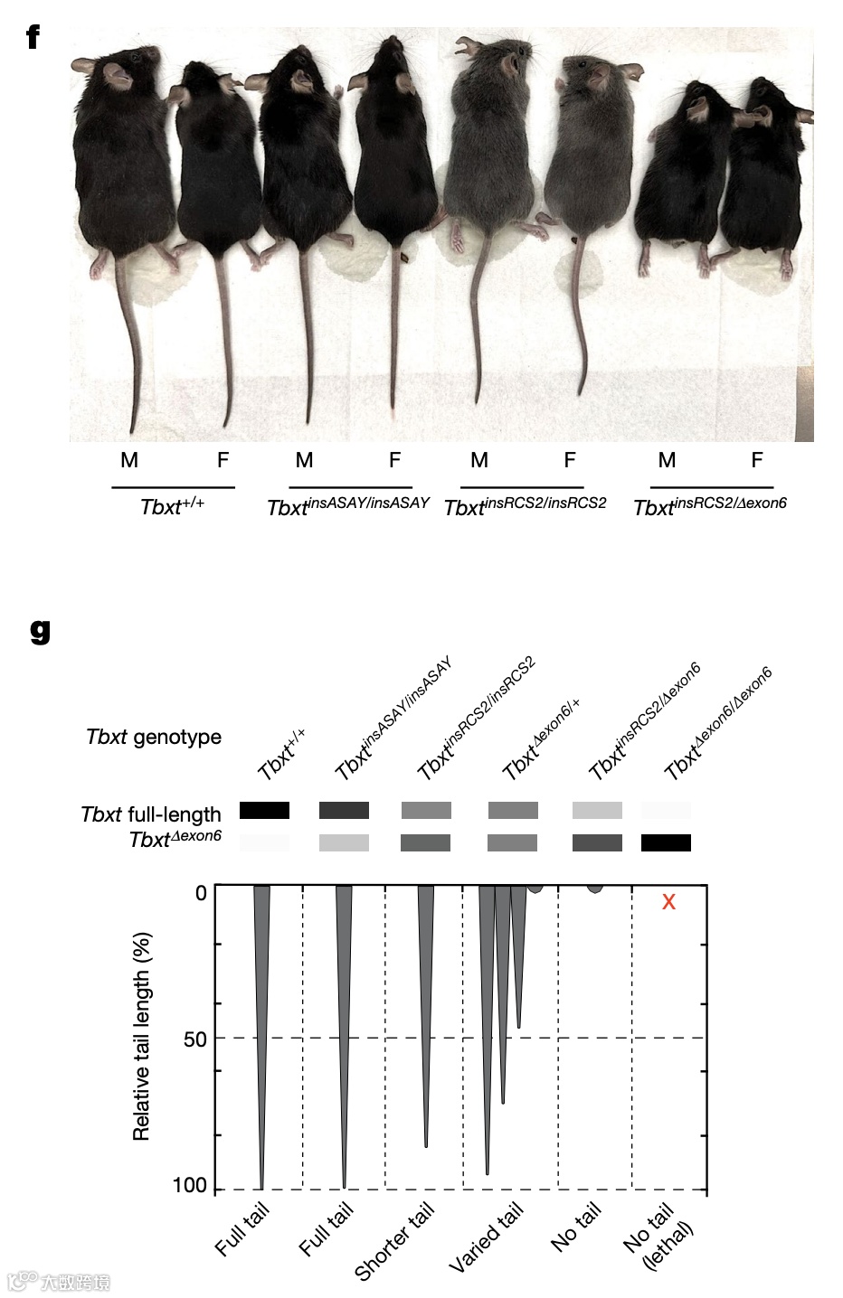 与之相印证,当生成TbxtinsRCS2/Δexon6小鼠时,TBXTΔexon6转录本表达量更高,所有19只复合杂合子小鼠均完全没有外部尾巴!这些结果使得研究团队得以最终发现Tbxt两个转录本的相对比例与尾巴长短发育的大致关系。