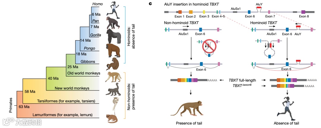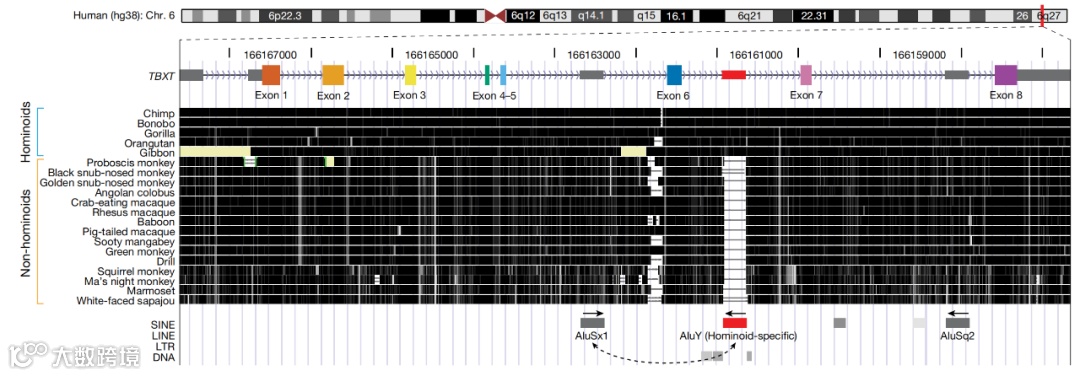 研究团队在一个名为TBXT(也叫T或者Brachyury)的基因中发现了一个强有力的怀疑对象——一个名为Alu元件的短DNA插入。有意思的是,这个Alu元件存在于所有类人猿中,但在其他灵长类动物中缺失。