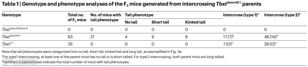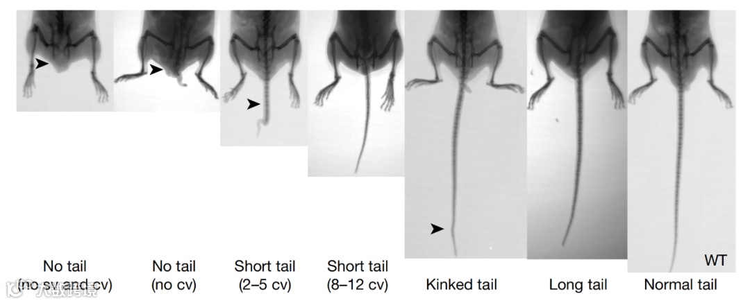 研究团队构建了TbxtΔexon6/+杂合子小鼠(纯合子不能存活),它们表现出强烈但异质性的尾巴形态,包括无尾和短尾表型。具体来说,63只杂合子小鼠中有21只表现出程度不一的尾巴缩短,而35只野生型同窝小鼠中没有一只表现出异常的尾巴表型。这一结果进一步证明了TBXTΔexon6转录本的存在可以导致小鼠的尾巴退化。