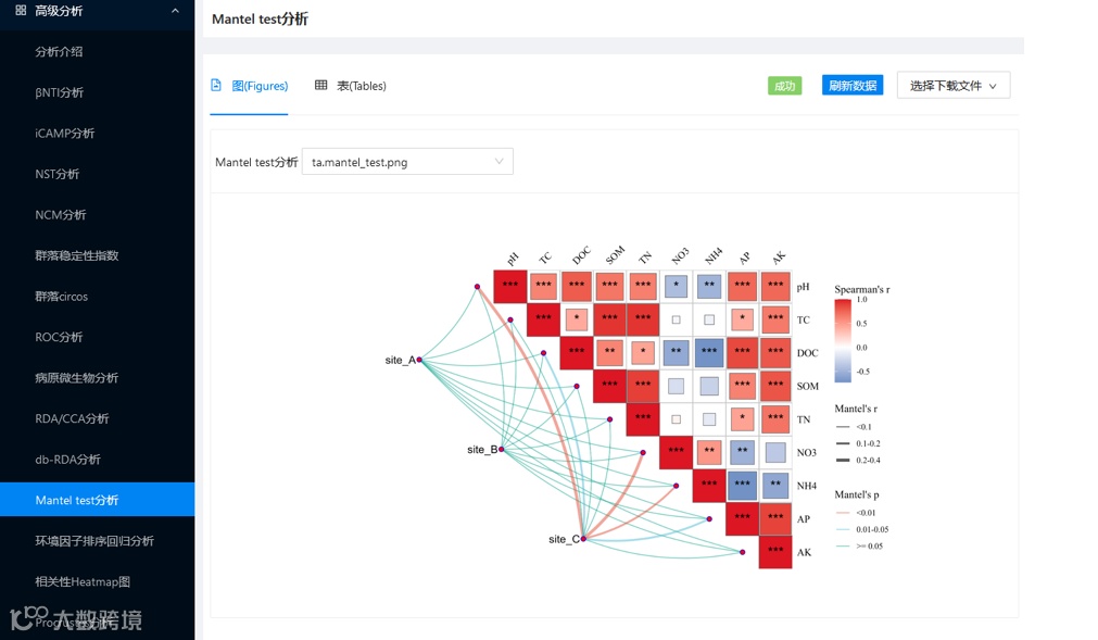 。微生物群落结构复杂,其多样性受到多种因素的综合影响,如地理环境、土壤性质、水体化学特征等。Mantel Test 能够帮助研究人员探究微生物群落的多样性(如物种丰富度、均匀度等)或群落组成与这些环境因素之间的相关性。