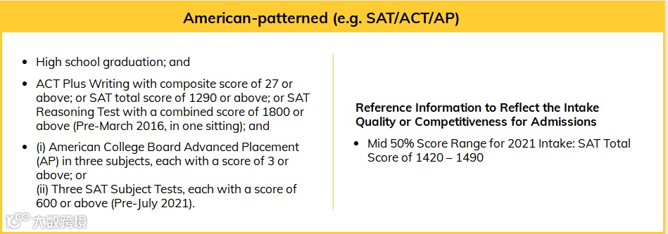 ACT综合得分达27分及以上或SAT要求总分1290以上,和AP课程3门达到3分以上;