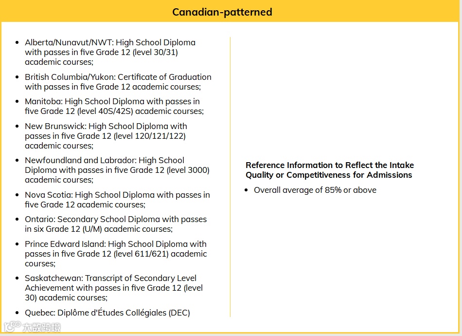 阿尔伯塔文凭(Alberta)文凭至少5门12年级课程,总体成绩达85%及以上;