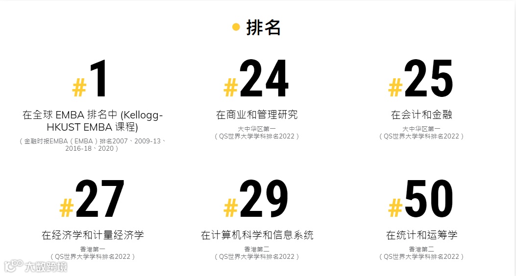 香港科技大学商科专业的发展更是得益于香港特殊的政治地位和经济地位,其商学院香港排名第一、商学院亚洲排名第一全球第二十五、MBA课程亚洲排名第一全球第十四、EMBA课程始终位居金融时报全球EMBA课程世界第一。