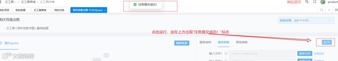 5. 点击运行,会在页面上方出现任务提交成功标志。可以通过刷新任务或进入云工具任务查看对应任务的进度;