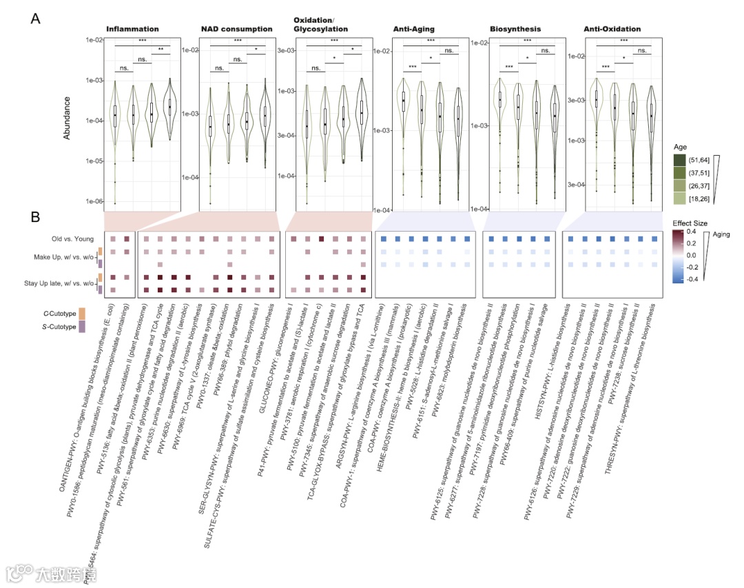 微生物代谢途径丰度的变化不仅与年龄有关,还受到生活方式的影响。研究人员发现化妆和熬夜与衰老相关的微生物代谢途径呈正相关的关系(图6)。