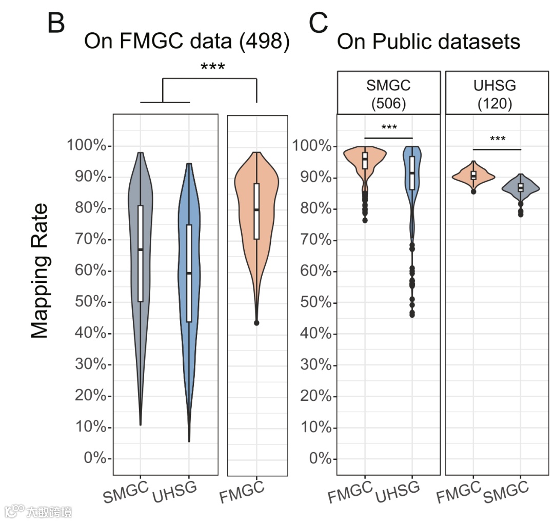 图2 不同来源的面部宏基因组测序数据与FMGC、SMGC和UHSG的MAGs的映射率比较