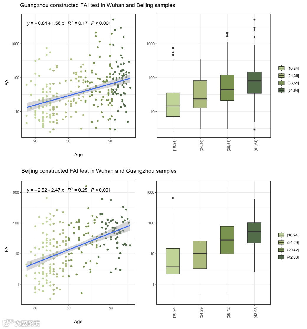 由于年龄显示出了瞩目的显著性,为了评估年龄对面部微生物群的影响,研究者开发了一个基于微生物群的FAI,用以评估个体的皮肤衰老程度。FAI分数越高,表示皮肤衰老程度越高。