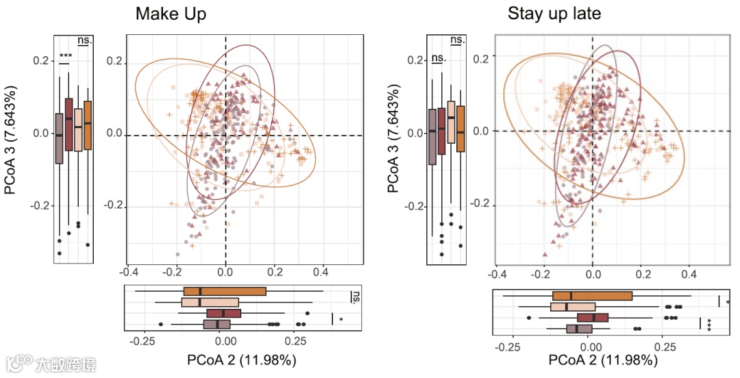 图5 具有/不具有某些生活习惯和不同皮肤类型的参与者之间整体微生物群结构的差异(左为化妆组,右为熬夜组)