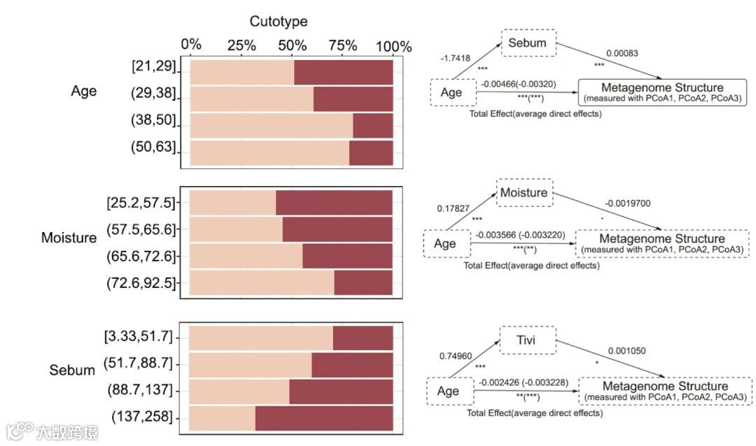 图3 左:当根据年龄、水分和皮脂分布情况将其均匀分组时,观察到的不同皮肤类型的比例;右:中介分析结果显示年龄与面部微生物的群落结构具有显著相关性