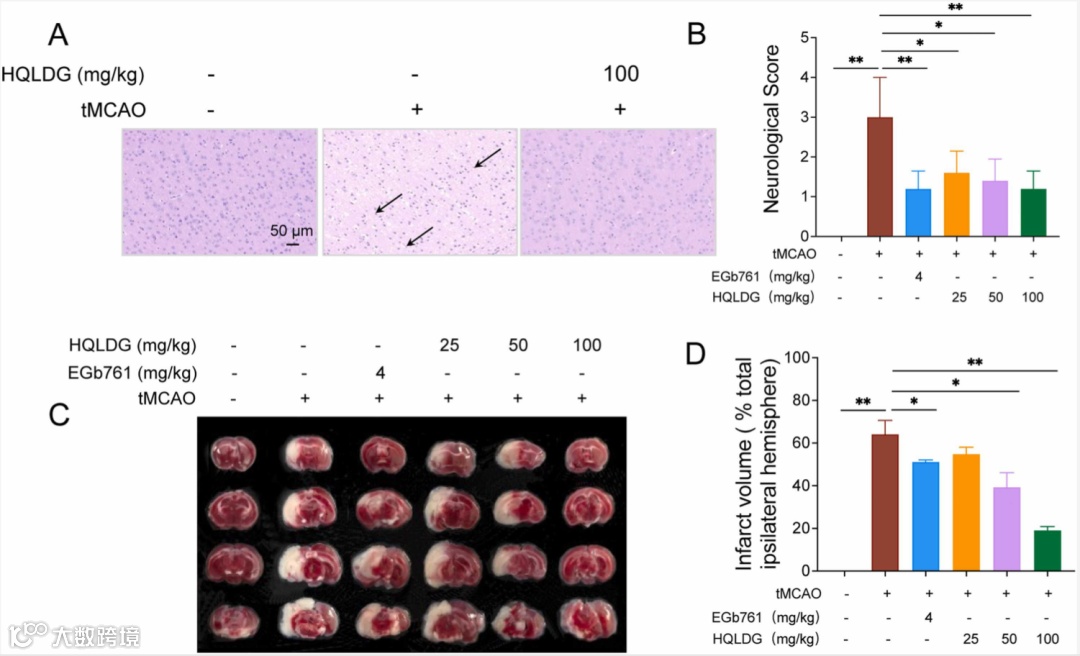 经HQLDG处理后,细胞形态和排列得到改善。采用大脑中动脉闭塞法制备缺血性脑卒中小鼠模型。HQLDG显著降低梗死面积和神经学评分。此外,HQLDG可以改善小鼠脑组织染色病理,包括改善细胞形态。这些结果提示HQLDG可能对缺血性脑卒中具有保护作用。