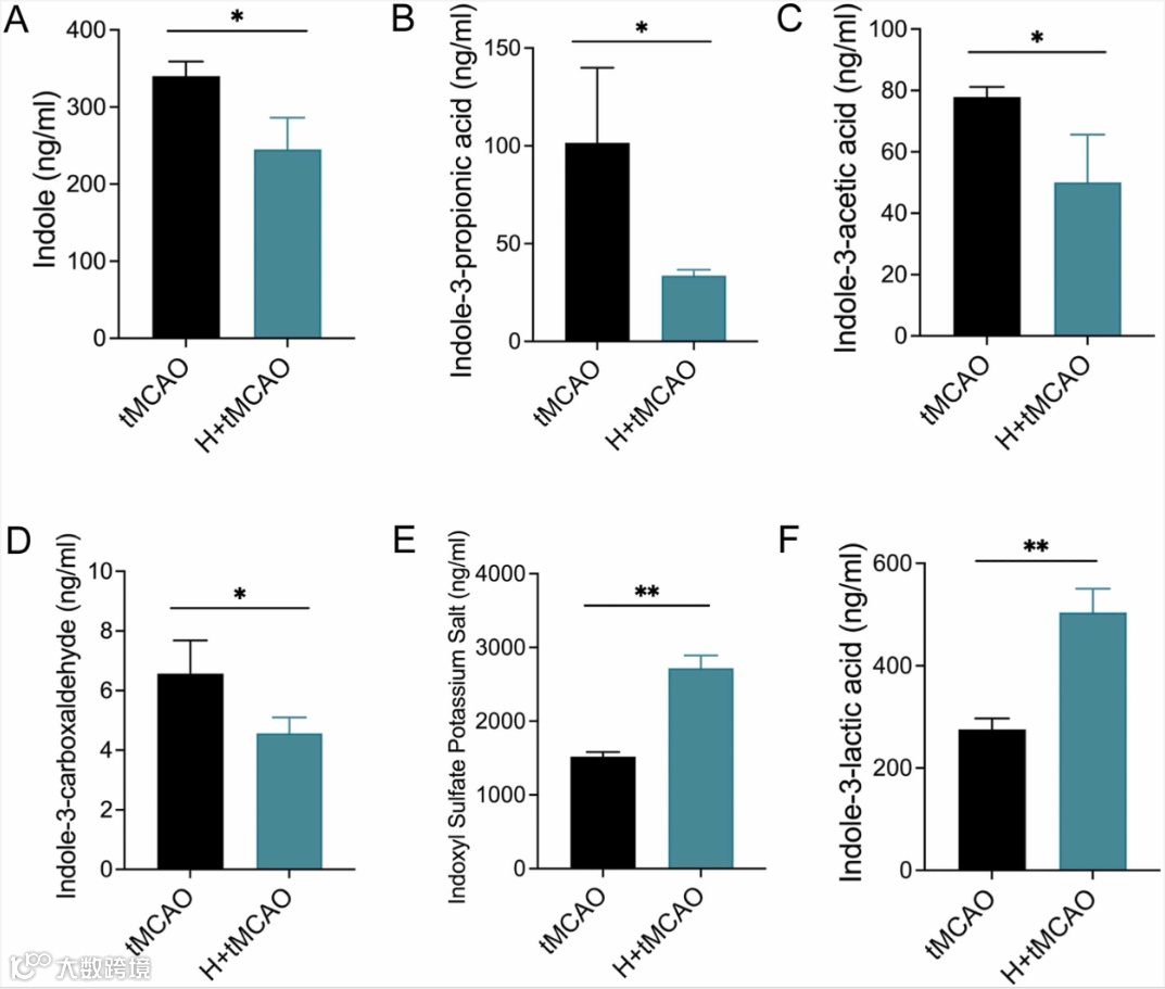 通过代谢组学研究HQLDG处理组和tMCAO处理组的代谢差异。差异代谢物KEGG通路分析显示,HQLDG调控的前15条通路分别是小细胞肺癌、色氨酸代谢、蛋白质消化吸收、铁死亡等(图6C)。3-吲哚丙酸属于色氨酸代谢,VIP评分较高(图6D)。接下来,本研究进行了针对色氨酸的代谢组学分析,以确定HQLDG对色氨酸代谢的调节作用。如图7所示,HQLDG能显著降低血清中吲哚、吲哚-3-丙酸、吲哚-3-甲醛和吲哚-3-乙酸的含量(图7A-D),提高血清中吲哚硫酸酯钾盐和吲哚-3-乳酸的含量(图7E-F)。这些代谢物属于色氨酸代谢的吲哚途径,与免疫调节密切相关。