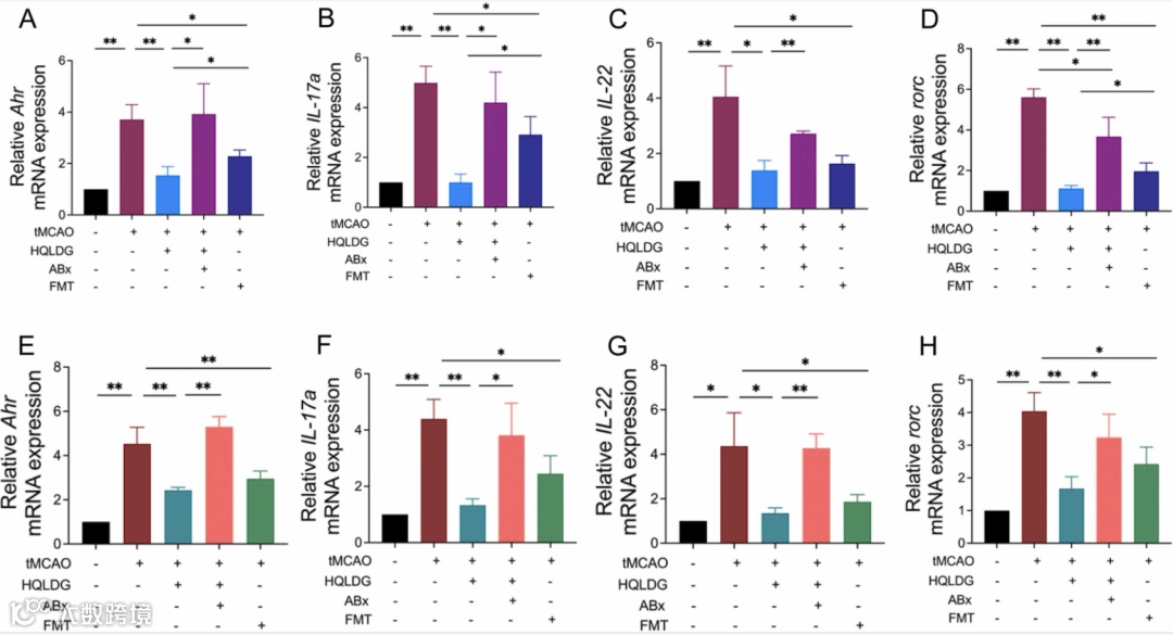 有研究报道,属于g_Akkermansia的Akkermansia muciniphila可以将Trp代谢为吲哚,Trp代谢可激活AhR,进而调控Th17信号。基于此,本研究使用抗生素和粪便微生物群移植来确定肠道微生物群在HQLDG抗缺血性脑卒中的作用。HQLDG治疗可显著降低血清炎症因子IL-17A、IL-22;下调Ahr、IL-17a、IL-22、rorc的表达。相反,去除肠道菌群后,HQLDG的作用受到损害。HQLDG处理小鼠移植的粪便微生物群对tMCAO损伤有积极作用。这些结果表明,肠道菌群调节可能是HQLDG抗tMCAO损伤的重要中介。AhR将色氨酸代谢和免疫调节联系起来。