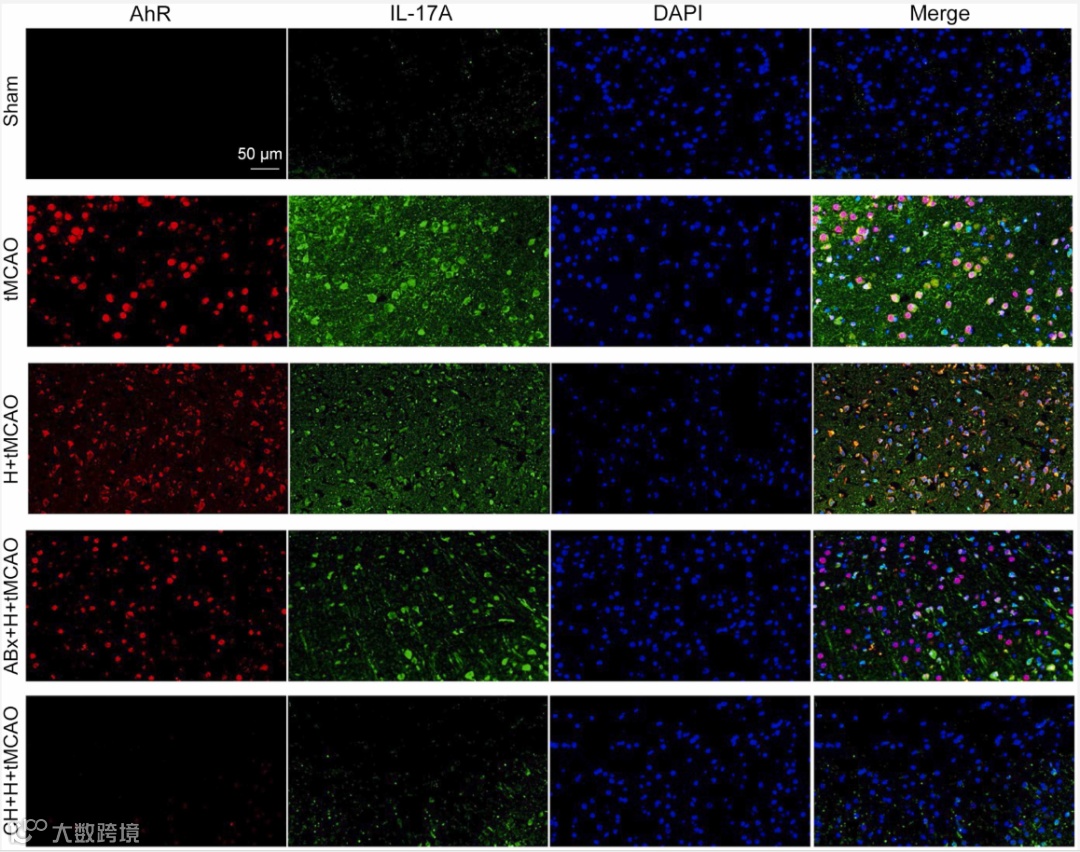 接下来,使用AhR抑制剂来确定色氨酸代谢的作用。HQLDG可降低AhR和IL-17A的免疫荧光。肠道菌群去除后,与HQLDG处理组相比,AhR和IL-17A的免疫荧光增加。抑制AhR后,IL-17A的免疫荧光降低。