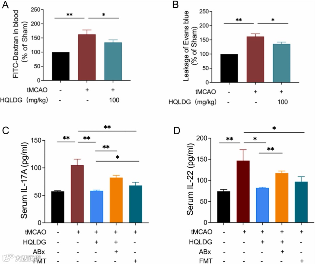 采用FITC-葡聚糖和Evans Blue 检测脑血屏障(BBB)的完整性。tMCAO处理组中FITC -葡聚糖明显升高。HQLDG处理显著降低血液中FITC -葡聚糖含量(图9A)。tMCAO治疗组脑组织EB明显升高。HQLDG处理显著降低脑内EB含量(图9B)。ELISA试剂盒检测血清IL-17A和IL-22。tMCAO处理组大鼠血清中IL-17A、IL-22浓度显著升高。HQLDG显著降低血清中IL-17A和IL-22的浓度。此外,移植HQLDG处理小鼠的粪便微生物群可显著降低血清中IL-17A和IL-22的浓度。然而,抗生素与HQLDG联合治疗削弱了HQLDG对血清IL-17A和IL-22的抑制作用(图9C-D)。这些结果表明,肠道微生物群在HQLDG抗缺血性脑卒中的作用中起重要作用。