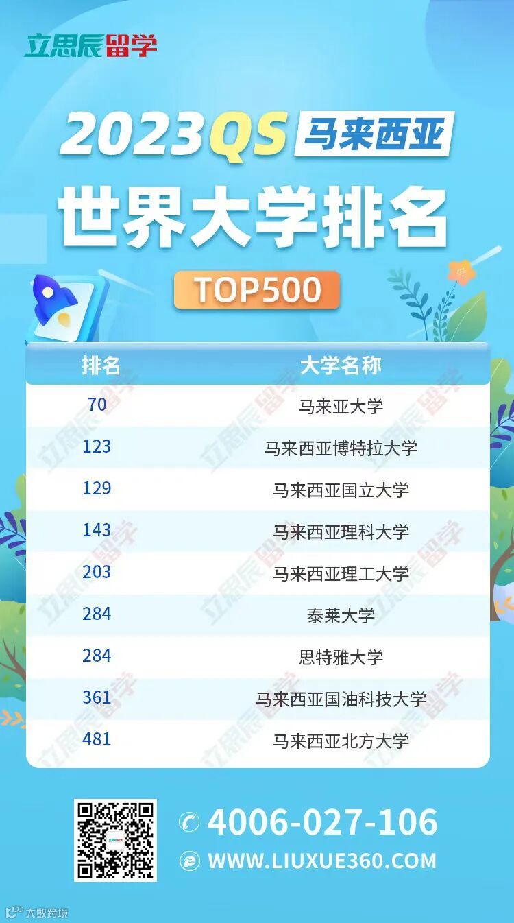 在2023年QS世界大学排名中,马来亚大学位于第70位,马来西亚第一;博特拉大学、马来西亚国立大学、马来西亚理科大学分别位于第123、129、143位,马来西亚第二、第三、第四;马来西亚理工大学则位于第203位,马来西亚第五。