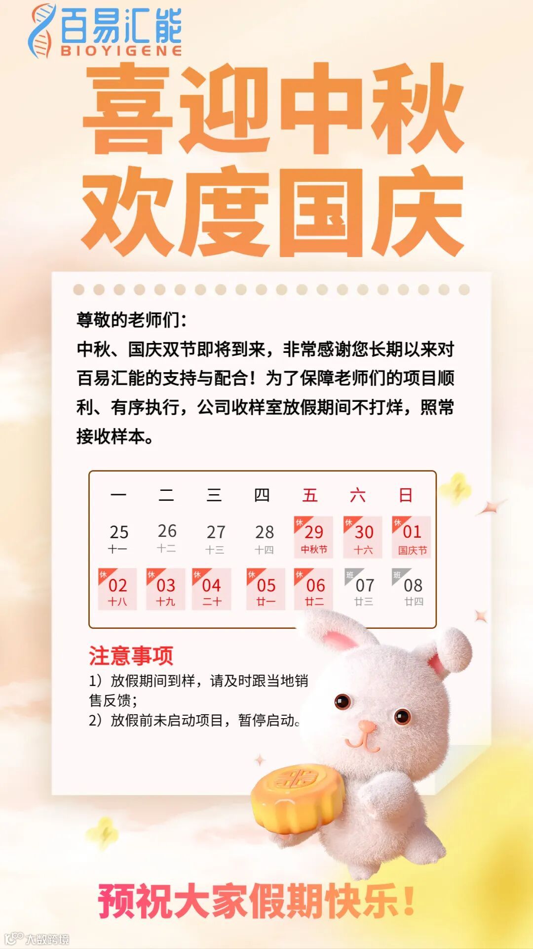 中秋节过后马上就迎来我们的十一国庆, 中秋是家人的团圆,国庆是祖国的大团圆,中秋遇上国庆,便是家国共团圆。花好月圆中秋日,人和家兴国庆节;祝福声声举国欢,问候绵绵全家乐。百易汇能双节送祝福:祝大家中秋国庆快乐!