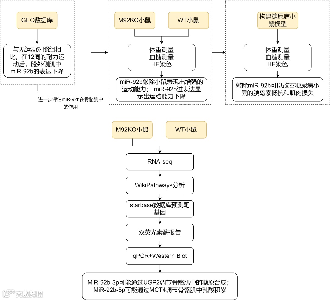 本研究发现:与对照组小鼠相比,miR-92b的敲除导致小鼠正常的体重和胰岛素敏感性发生变化,但运动前的糖原含量较高,运动后的乳酸水平较低,运动能力较好。过表达miR-92b(miR-92b-3p和miR-92b-5p)的小鼠骨骼肌在运动力竭前显示出较低的糖原含量,在运动力竭后显示出较高的乳酸积累,以及较差的运动能力。分子机制分析显示,miR-92b-3p靶向UDP-葡萄糖焦磷酸化酶2(UGP2)表达以抑制糖原合成,而miR-92b-5p通过直接靶向单羧酸转运蛋白4(MCT4)抑制乳酸堆积。UGP2和MCT4的敲低则逆转了在体内不存在miR-92 b的情况下观察到的效应。本研究揭示了miR-92b的调节途径,包括miR-92b-3p/UGP2/糖原合成和miR-92b-5p/MCT4/乳酸堆积,可靶向控制运动能力。