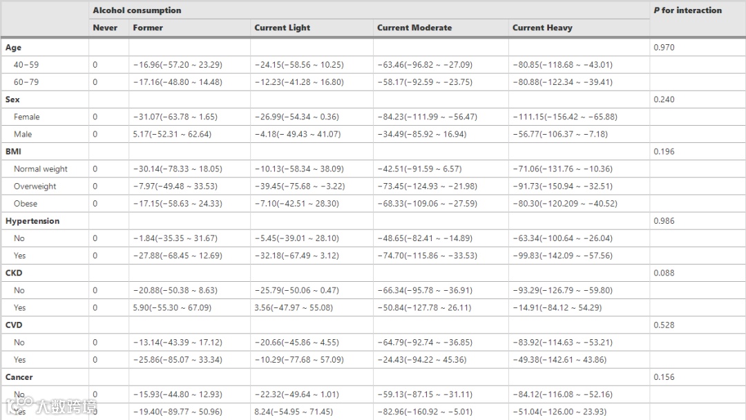 随后在分层分析中,按年龄、性别、BMI、高血压和癌症分层的亚组中,酒精摄入量与血清α - klotho水平之间的相关性和上述一致。然而,这种联系在慢性肾病、心脏病和癌症患者中并不显著。