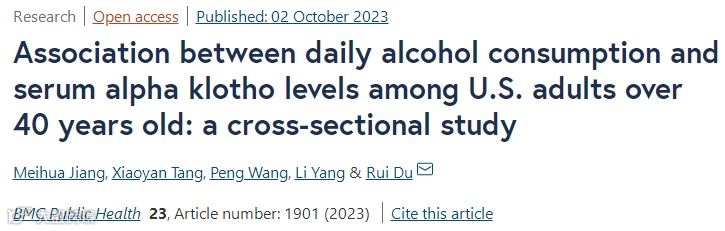 2023年10月2日,来自湖北中部战区总医院的研究团队在 BMC Public Health 杂志发表题为“Association between daily alcohol consumption and serum alpha klotho levels among U.S. adults over 40 years old: a cross-sectional study”的文章。