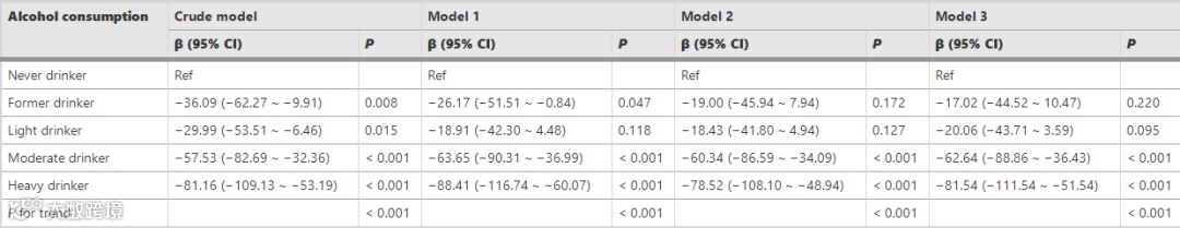 研究人员采用了4个多元线性回归模型评估每日酒精摄入量与血清α-Klotho水平之间的关系,发现中度和重度饮酒组的血清α - klotho水平明显较低。