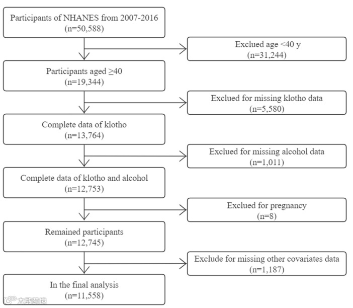 该研究选择了在2007年至2016年NHANES数据库中的50,588参与者,根据年龄、疾病状况以及数据缺失等进行排除,最终将11,558人纳入研究。