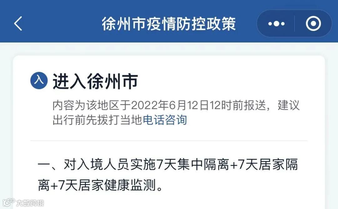 据“国务院客户端”小程序显示,江苏省常州市、徐州市入境人员的隔离时间已由原先的“14+7”调整为“7+7”,即7天集中隔离+7天居家隔离,缩短了7天的集中隔离时间。