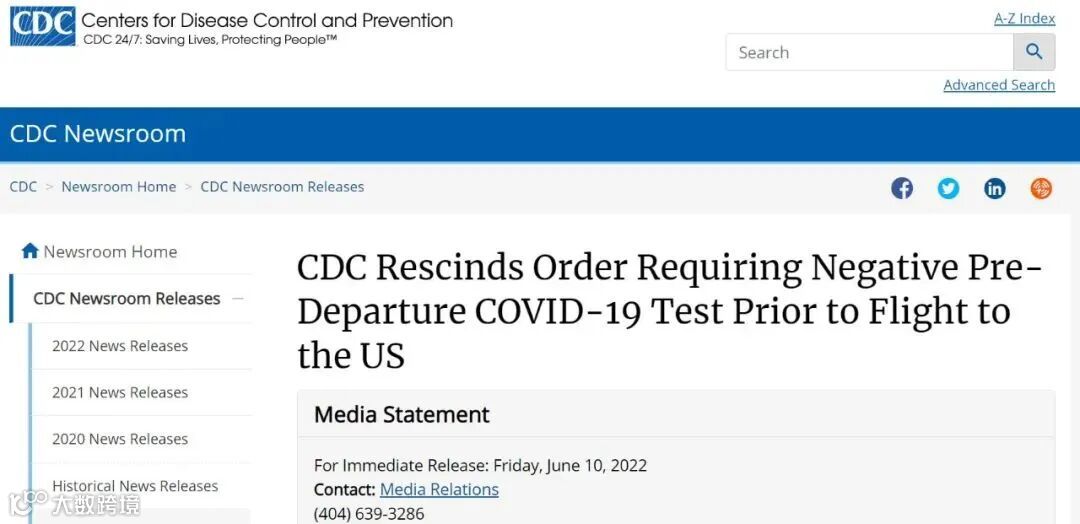 美国宣布:从2022年6月12日零点起,取消外国旅客在入境美国出发前对新冠病毒进行检测的要求!