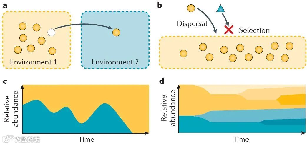 扩散(dispersal)、选择(selection)、漂变(drift)和多样化(diversification)。分类群通过从区域物种库(regional species pool)中扩散(dispersal)和原位(in situ)多样化(diversification)而被添加到局部的位置,进一步通过选择(selection)和漂变(drift)形成分类群的相对丰度。