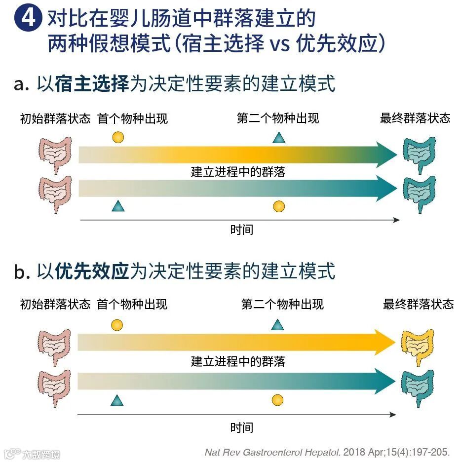关于优先效应是如何在幼儿期形成微生物群落装配(assembly)的知识,我们知之甚少,因为很少有研究报道定殖的时间和顺序,但间接证据表明优先效应是可信的。