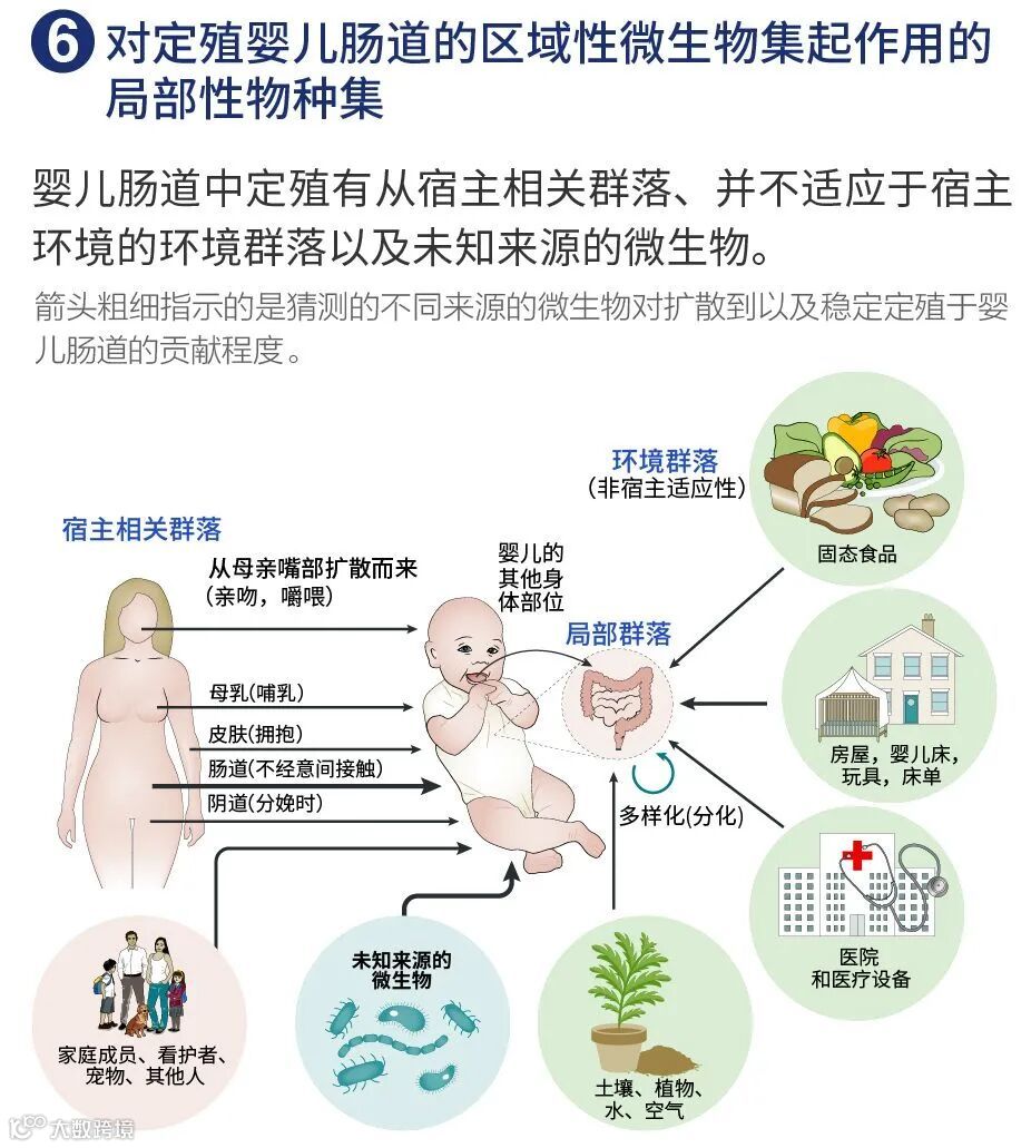 婴儿被来自宿主相关群落、不适应寄主的环境群落和未知来源的微生物定殖。箭头的粗细表示来自不同来源的微生物扩散到并稳定地定殖在婴儿胃肠道的推定相对贡献。