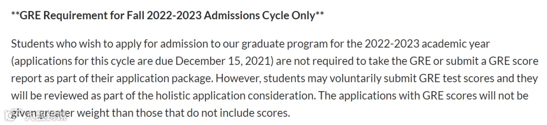 对于国际学生来说,有一个优秀的GRE成绩,还是更容易脱颖而出的。另外要注意,申请人如果在申请时自报了GRE分数,那在入学时必须提交正式的GRE成绩报告。这个政策跟杜克大学是一致的。