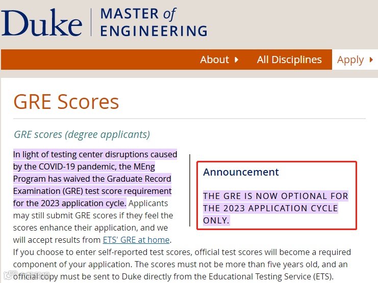同时,杜克也说了,如果申请人觉得自己的GRE成绩可以增加自己的申请竞争力,也可以选择提交;同时,杜克大学接受GRE家考成绩。另外要注意,如果在网申中填写了GRE分数,那么就必须要通过ETS送分至杜克。