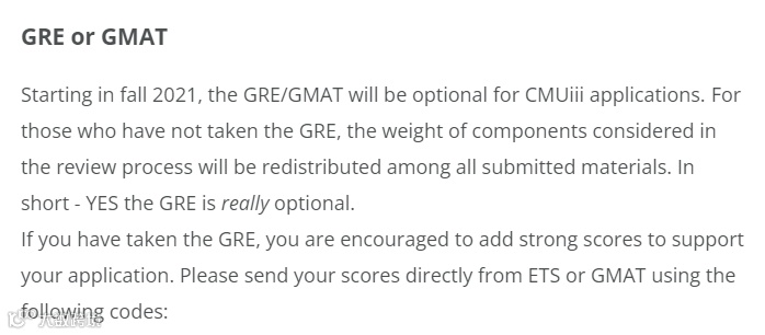 CMU的整合创新学院对GRE/GMAT的要求也是Optional,然而学院也明确表示:如果不提交GRE/GMAT成绩,评估审核权重将被重新分配到其他申请材料中。