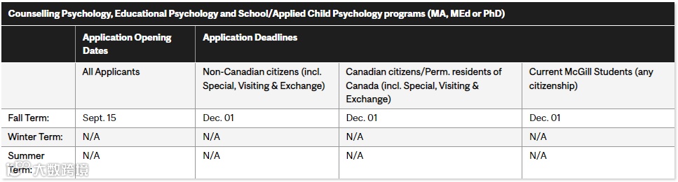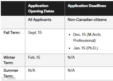 大部分院校的申请通道在9月和10月开放:比如麦吉尔大学于9月15日开放;多伦多大学教育学专业于10月上旬开放。