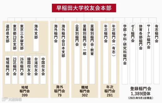 早稻田大学在第一届毕业生毕业的第二年(1885年),成立了为母校支援做出贡献的同窗会“早稻田大学校友会”。学生毕业的同时成为校友会员。
