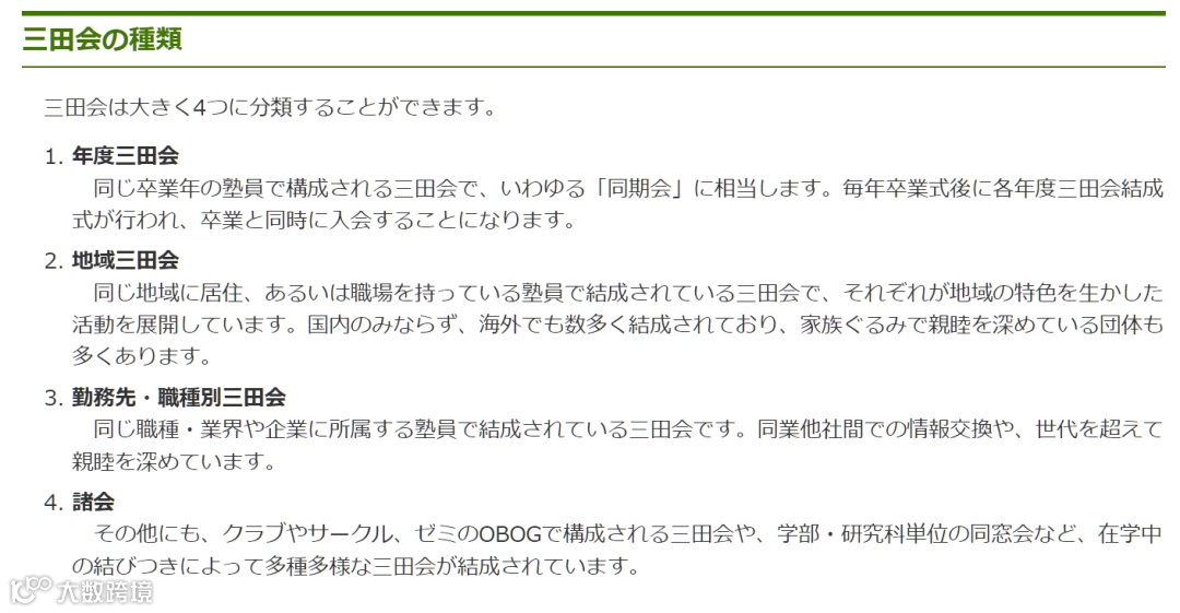 包括所有三田会在内的组织叫做庆应联合三田会,不仅仅可以让塾员之间进行交流,在校的塾生也可加入。