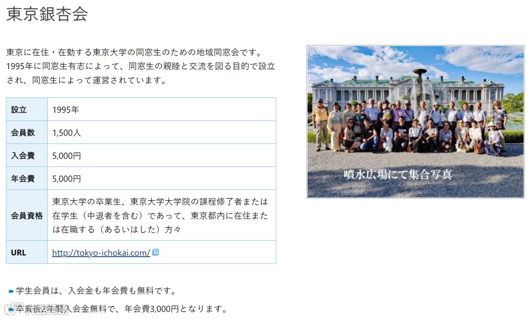 东京大学校友会根据学科、地域等分类,又分为不同的同窗会团体。同窗会中,有以医学部医学科毕业生为中心的铁门俱乐部,还有住在东京都内的毕业生所属的东京银杏会等等。