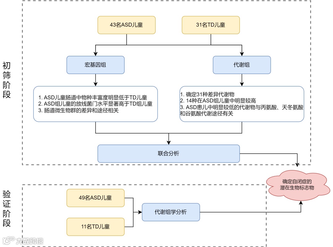 本研究中,作者收集了92名ASD儿童和42名与年龄密切匹配的正常发育(TD)儿童的粪便样本。在初筛阶段,对43名ASD儿童和31名TD儿童的粪便样本进行宏基因组测序和代谢组学分析。在验证阶段对49名ASD儿童和11名TD儿童进行代谢组学分析,确定与肠道微生物群组成改变相关的肠道代谢物。综上所述,患有自闭症的儿童肠道代谢物成分变化与肠道微生物群组成变化有关,这些发现有助于基于肠道微生物和代谢产物来开发诊断自闭症的新方法。