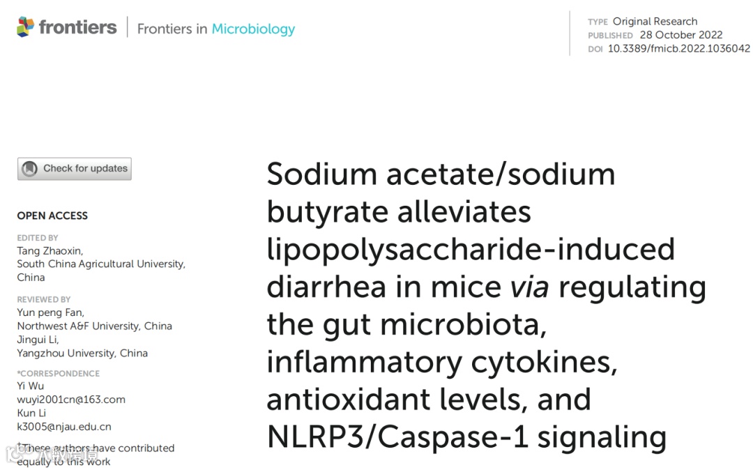 2022年10月28日,由南京农业大学和华中农业大学研究团队联合在《Frontiers in Microbiology》(IF=6.064)上发表了“Sodium acetate/sodium butyrate alleviates lipopolysaccharide-induced diarrhea in mice via regulating the gut microbiota, inflammatory cytokines, antioxidant levels, and NLRP3/Caspase-1 signaling”一文,作者前期研究发现腹泻牦牛的短链脂肪酸下降,丁酸盐通常与上皮功能障碍和肠道炎症有关,然而,乙酸钠/丁酸钠是否能缓解动物腹泻,目前尚不清楚。因此,作者提出假设:补充乙酸钠/丁酸钠可以缓解动物腹泻,并以小鼠的血清、小肠、直肠为研究对象,通过16s测序分析,旨在探讨乙酸钠/丁酸钠对脂多糖诱导的小鼠腹泻的潜在影响。