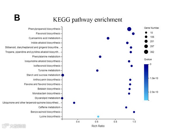GO注释分析显示40个基因被注释到了代谢相关通路中。KEGG分析显示689个基因主要注释在次生代谢产物的生物合成通路中(图4B)。